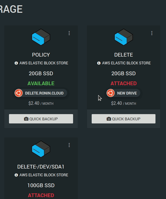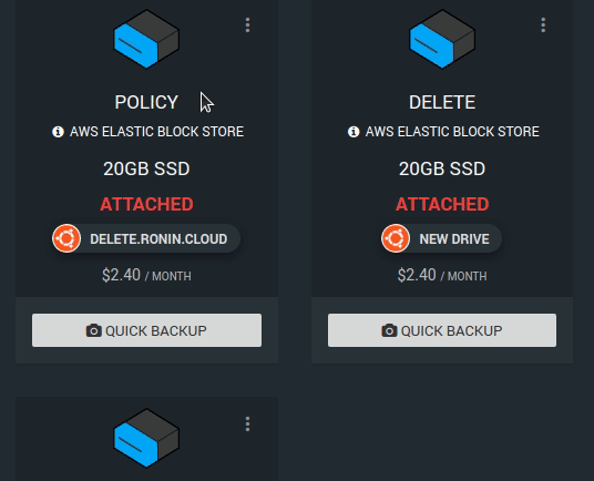 To delete the volume forever, click the three dot menu and click Delete Volume. If this project is being closed, you will need to enter the drive name, and uncheck the Backup this Volume before deleting:
