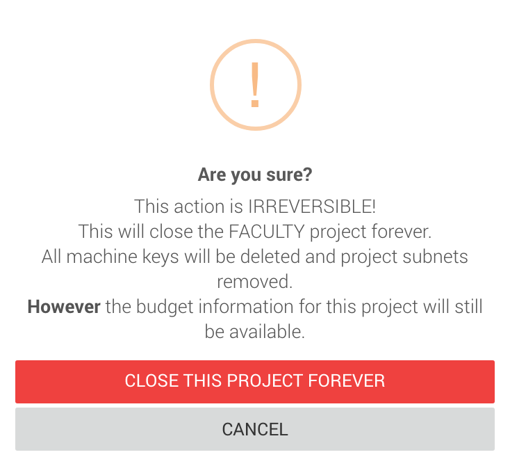 Be mindful that by closing this project you will be releasing the project subnet to be used by other new projects, it will also remove all access to the project so no prior users will be able to create new resources.