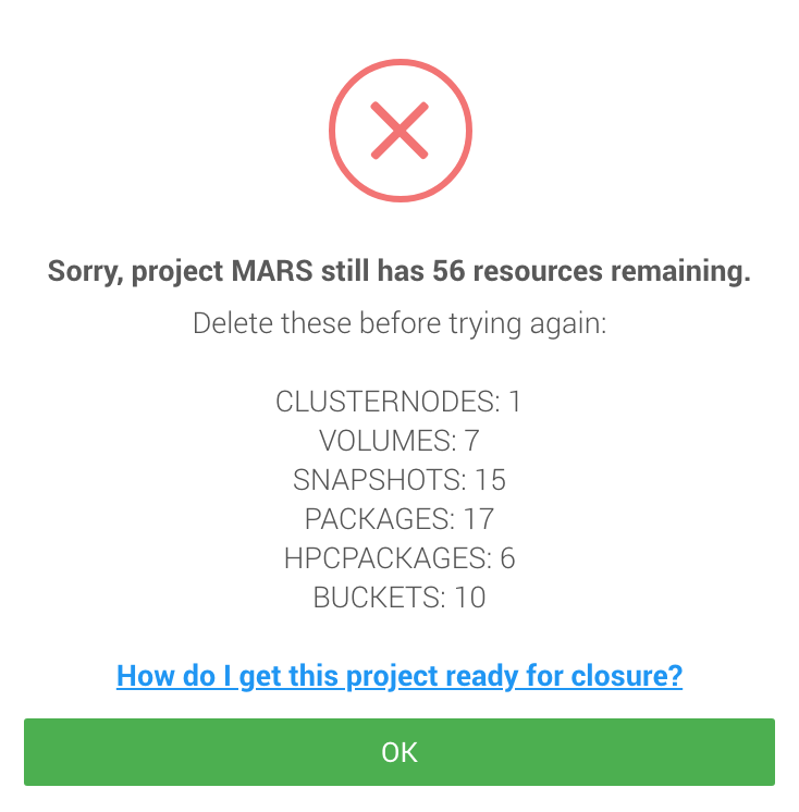 Click the red CLOSE button and we will check to see if there is anything left on this project that is currently accruing costs. If there is, you will see something like this: