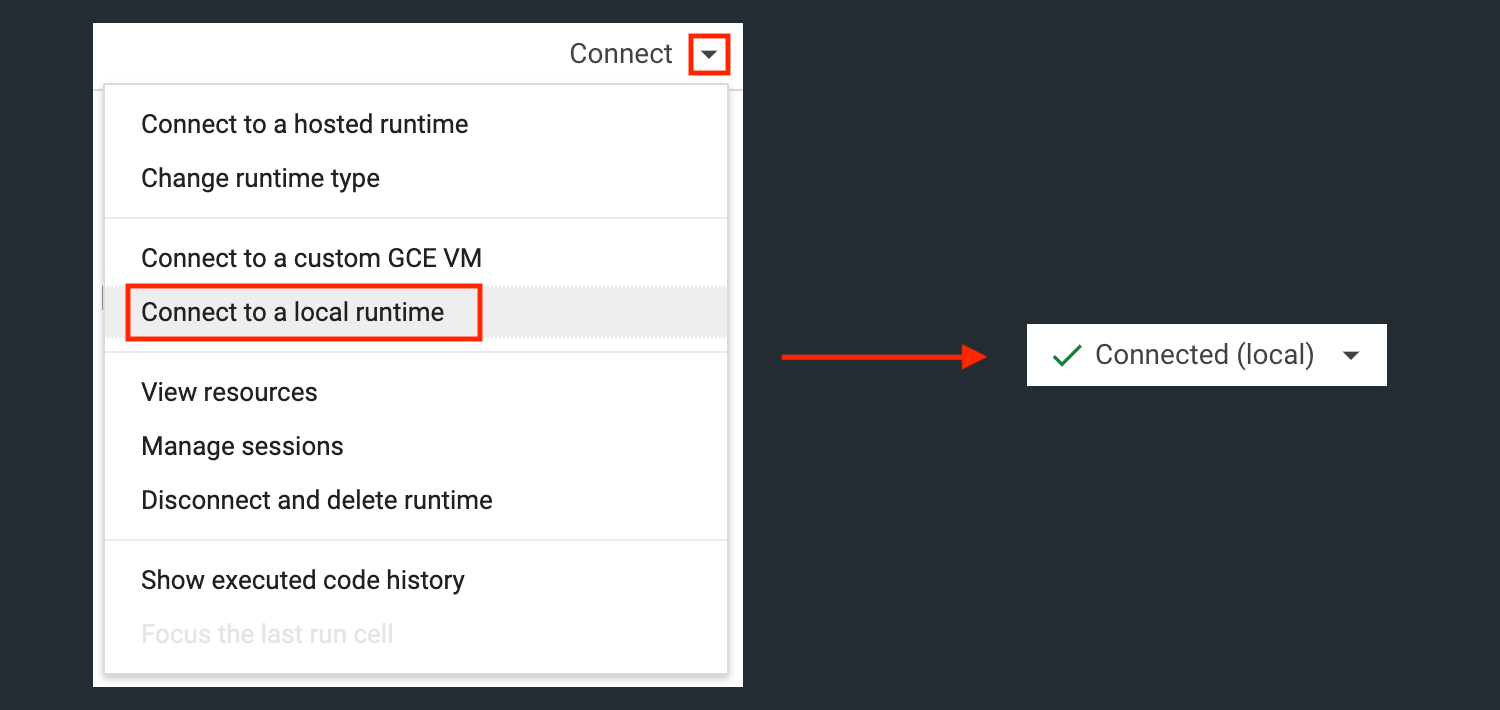 8. Open Google Colab, select the dropdown next to "Connect" and click "Connect to a local runtime". Paste in the URL from Step 6 in the modal that appears and click "Connect". Your Google Colab should then be connected to your RONIN Jupyter Notebook.