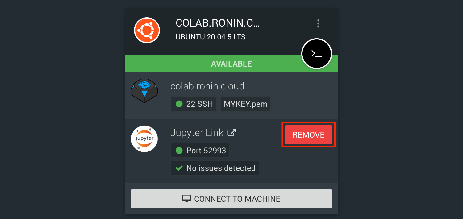 2. Open the machine in RONIN LINK and click the Jupyter LINK button in the "Connect to machine" modal to install Jupyter and ensure Jupyter opens successfully in your browser. More info here.