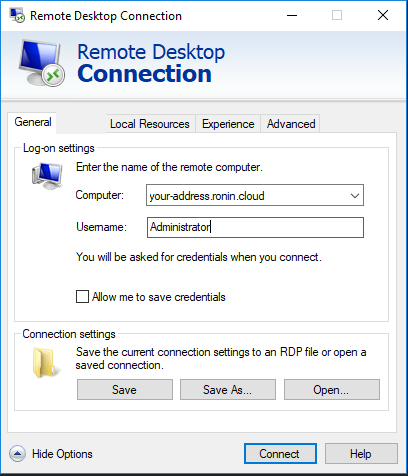 Domain - You might be asked to enter a domain when you connect, just enter a forward slash. Like this /Port - You might be asked to enter a port when you connect, RONIN uses the standard port number for RDP 3389