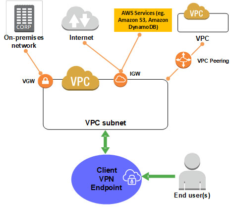 End-users will connect to the VPN endpoint and establish the VPN session from their local computer or mobile device using an OpenVPN-based VPN client application. Once connected, they will be able to securely access the resources in the VPC in which the associated subnet is located. They can also access other resources in AWS or an on-premises network if the required route and authorization rules have been configured.