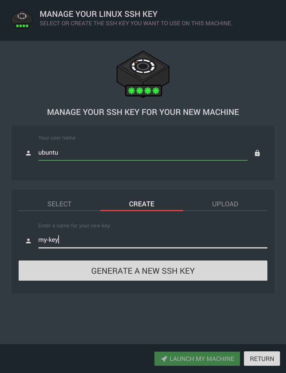 Your newly created key will be selected and you are now ready to launch your machine! Select the LAUNCH MY MACHINE button.