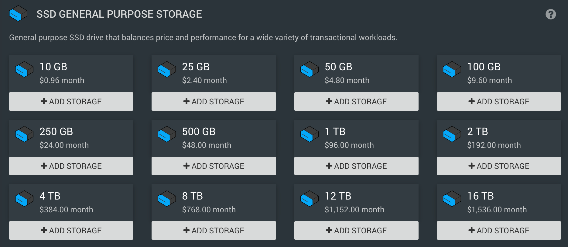 Again, RONIN provides you with a variety of sizes for the most popular storage type - a general purpose Solid State Drive. In this example we have added a 100GB drive.