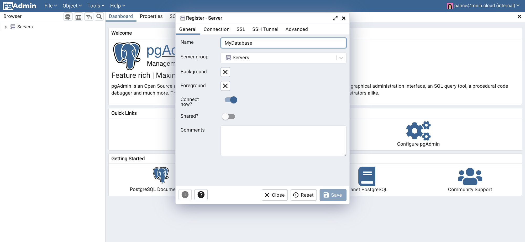 Once you have installed pgAdmin on the desired machine and logged in, click "Add New Server" and fill in the required details in the "General" and "Connection" tab as in Step 3. Then navigate to the "SSH Tunnel" tab, click the slider to "Use SSH Tunnelling", and fill in the following details: