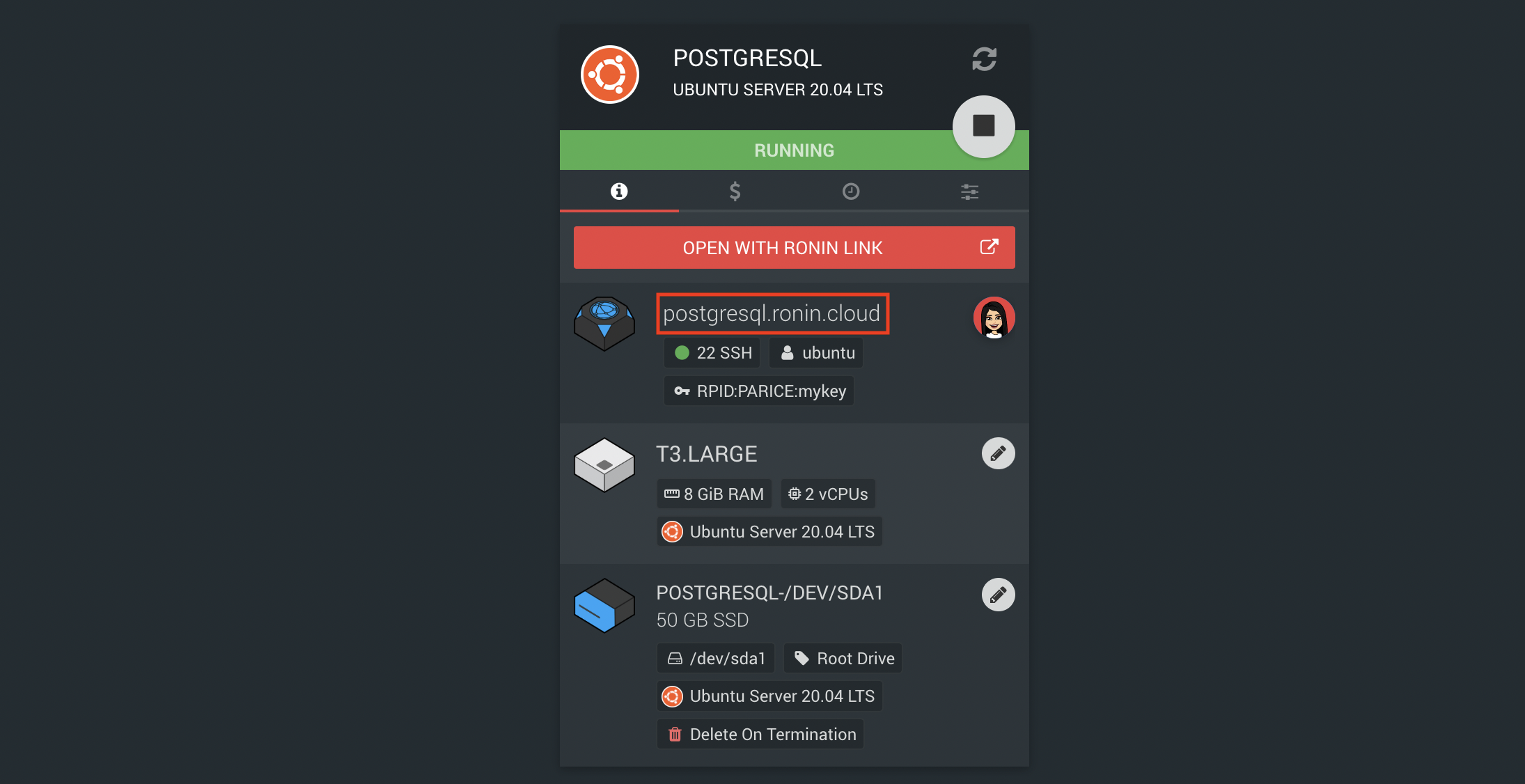 Create an Ubuntu 20.04 machine to run PostgreSQL. It should have a large enough root drive to store the data that you intend to analyze. Remember that with RONIN it is always easy to increase your storage or change your instance type later; you can start with a small general purpose instance for now.