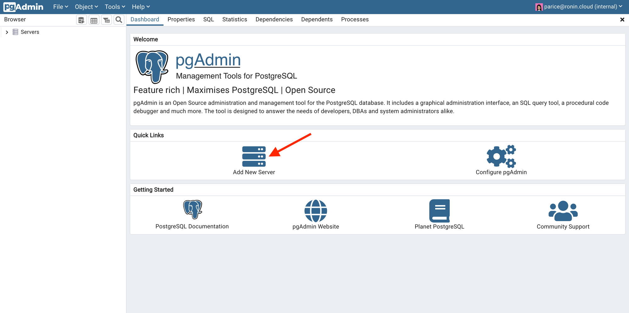 Now you can access the pgAdmin interface from a browser. There are two ways to do this: