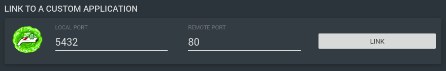 First open RONIN LINK and enter the port number 5432 for local port and 80 for remote port in the "Link to a Custom Application" box. Then click "Link".