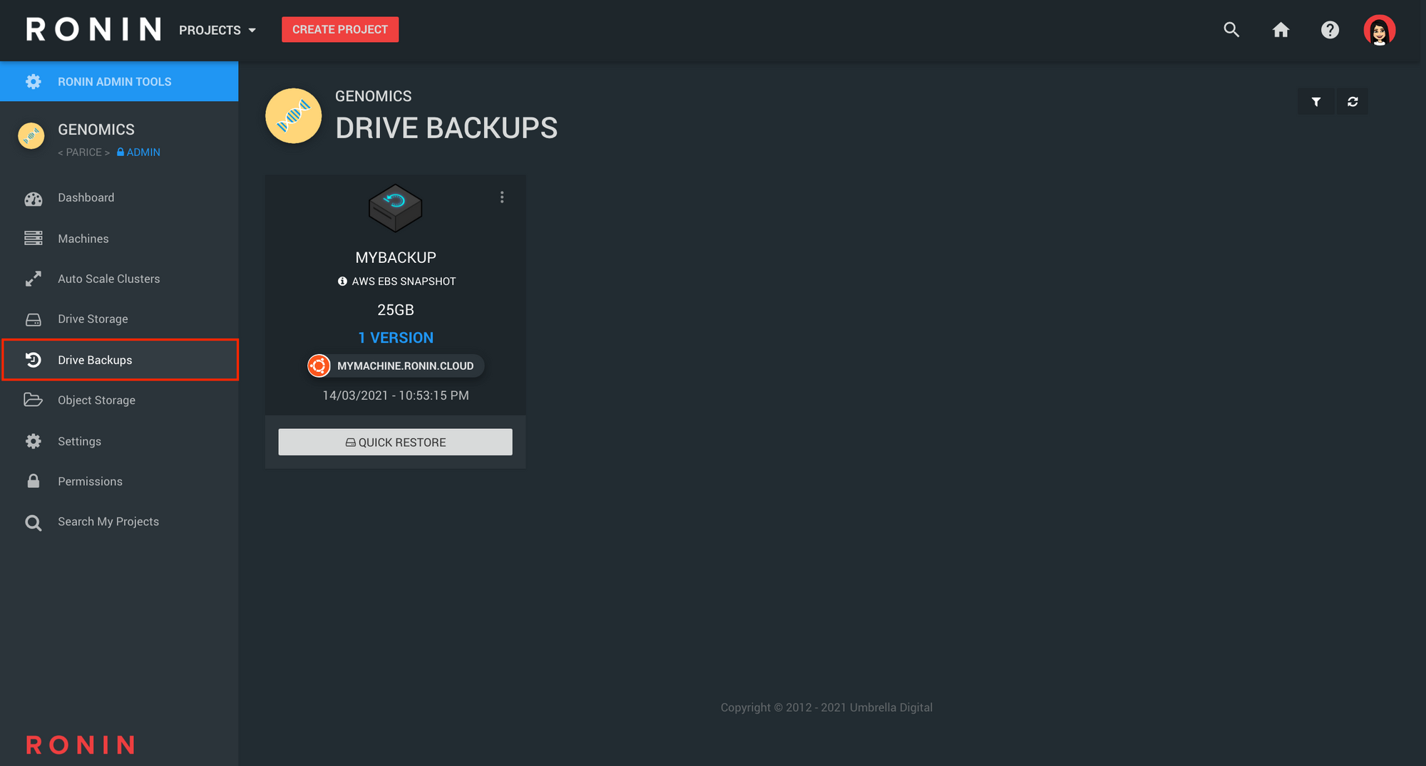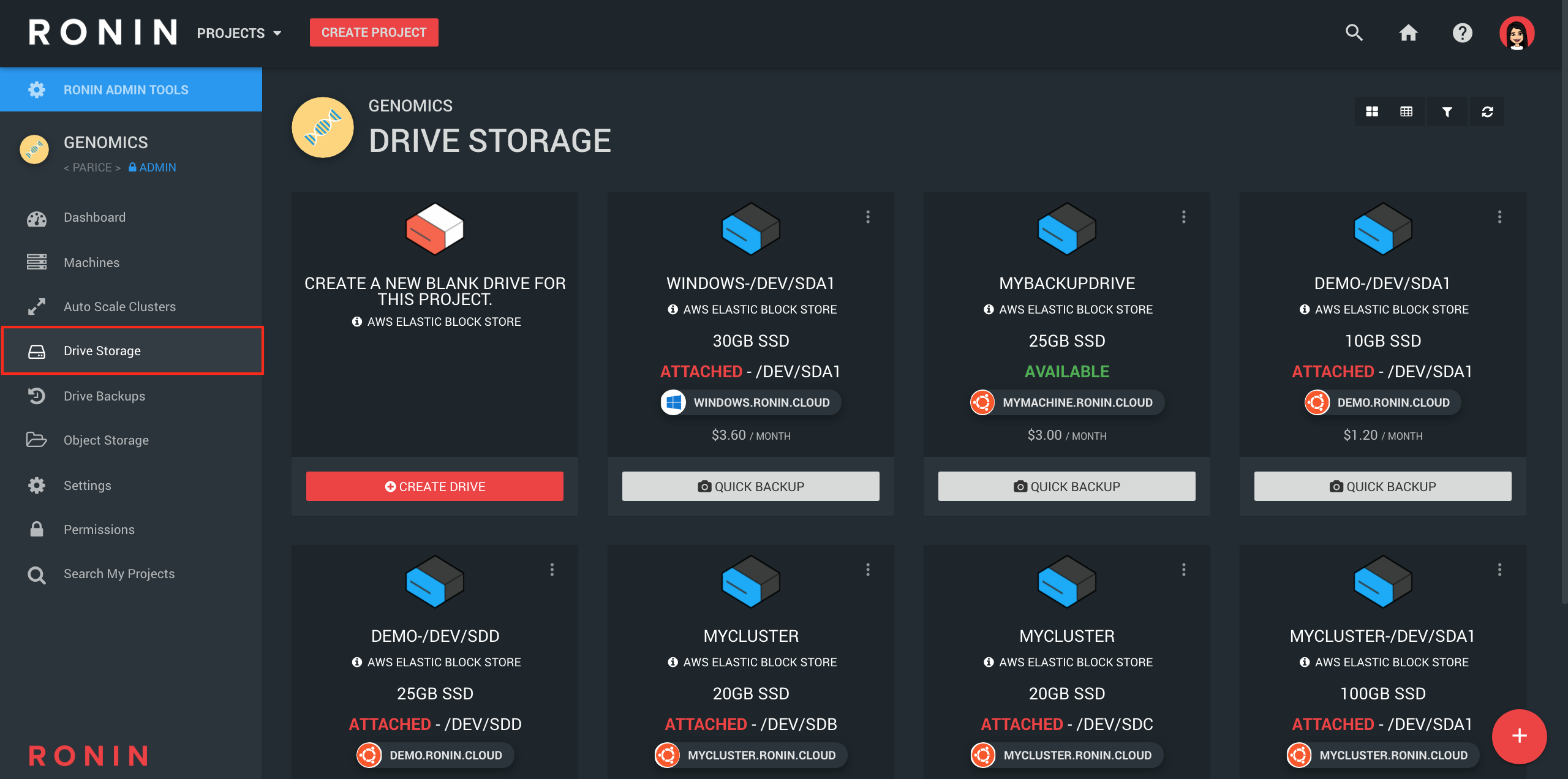 Drive backups (also known as Snapshots in AWS speak) are a great intermediate between object storage and storage drives. In RONIN, you can create a backup of any storage drive within your project which will create an exact copy of that drive with all the files on it at that point in time and store this information in object storage. This means it will be similar in price to object storage (there is a slight additional fee for snapshots of ~$0.055 per GB per month) but with the added benefit that it can quickly be restored back to a storage drive that can be reattached to a machine when needed. This is really useful for large or complex input datasets that may be used frequently within a project by one or more people as it prevents the need for data to constantly be manually copied back and forth to object storage but is more affordable than constantly keeping the data on a storage drive. Refer to this previous blog post to see how to take snapshots of drives in RONIN. In addition, multiple versions of drive backups can be created across different points in time so that you can always revert back to a previous backup if needed - see this blog post for more information.
