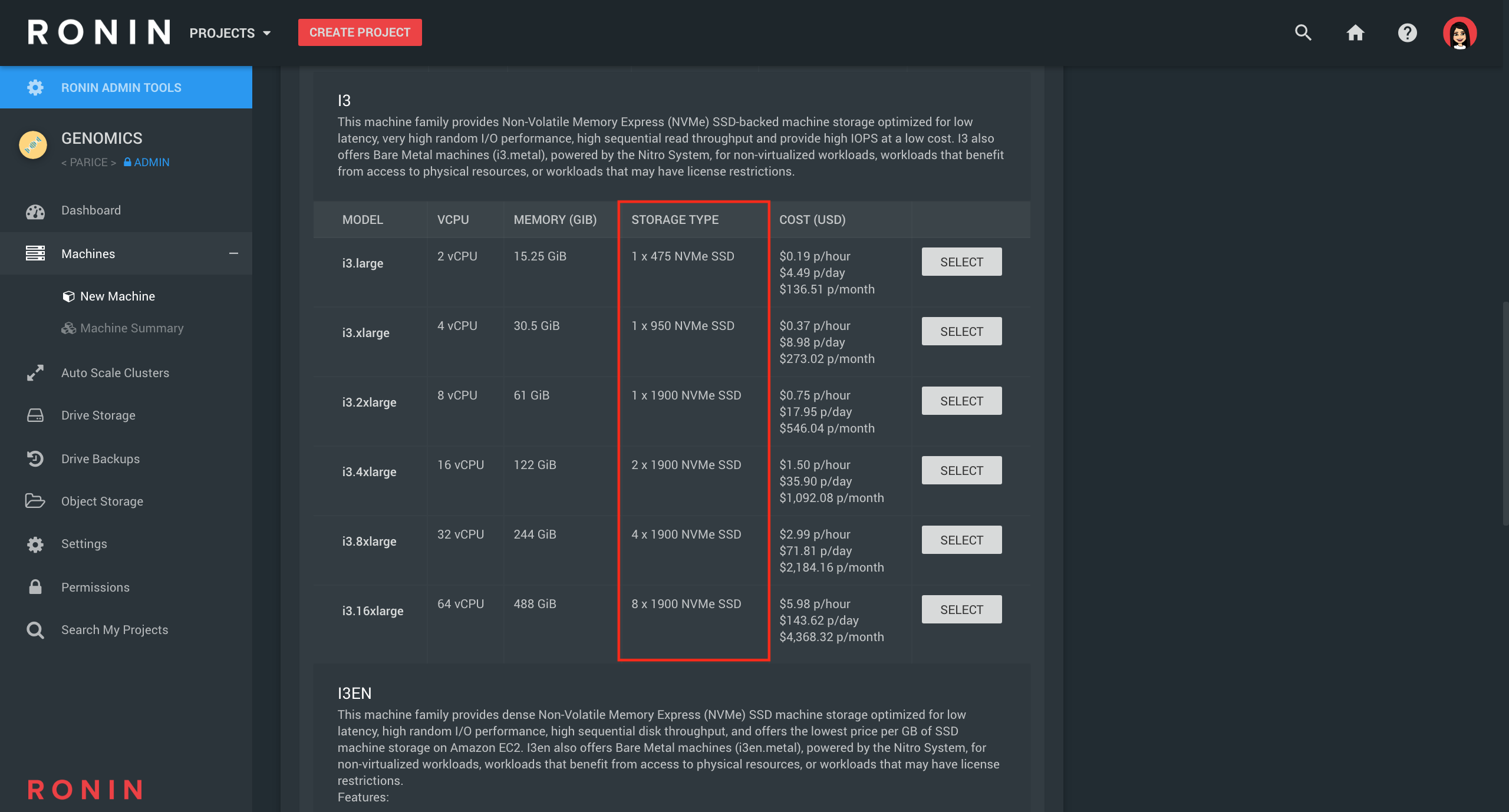 When creating a new machine or cluster in RONIN, you may notice that some of the machines you can select, especially the "Storage Optimised" machines, have some associated storage (in GB) listed in the "Storage Type" column as shown above. This storage is known as an "instance store" and these listed storage drives are physically attached to the machine. This makes them faster than drive storage. They have a fixed capacity and type, and are erased when the machine is stopped. These drives are included as part of the machine's usage cost and can be used like drive storage as above; however, you must transfer any data that you want to keep off instance storage (i.e. to object storage or to drive storage) before you stop or terminate your machine.
