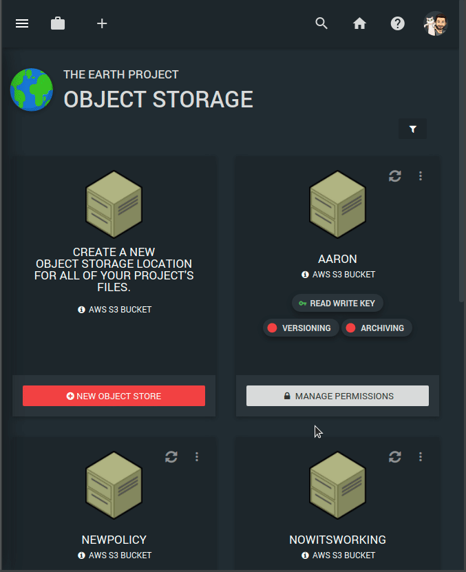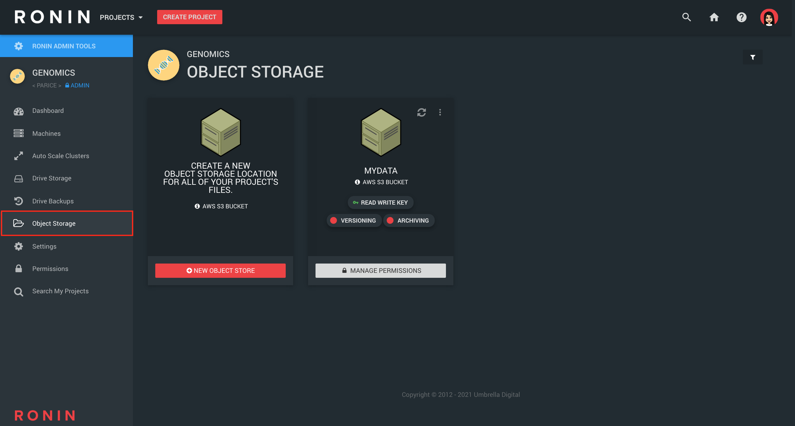Object storage (also known as Simple Storage Service or S3 in AWS speak) is the cheapest and the "safest" location to store all of your files in the cloud. Every file uploaded to an object storage bucket is automatically duplicated across multiple physical locations in the same geographic region, meaning that on average you might lose a file every few million years. Access to object storage buckets is tightly controlled based on access keys which can either be Read & Write or Read Only. Furthermore, for highly sensitive data our RONIN ISOLATE product provides a second layer of protection by restricting which machines or clusters are allowed access to such keys (see GIF below). Object storage is billed per GB of data per month and usually equates to ~$0.025 (US) per GB depending on your region. For a full overview of the costs for your region check out https://aws.amazon.com/s3/pricing/.