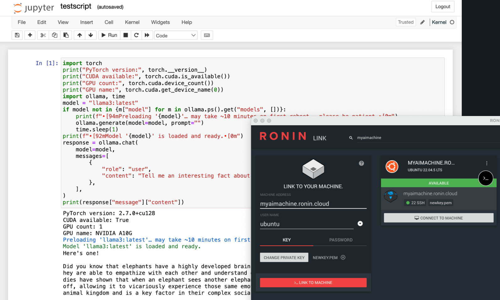 Whether you need a sandbox for LLaMA, a secure environment for sensitive data, or just raw GPU power without the setup costs, RONIN can handle the heavy lifting.