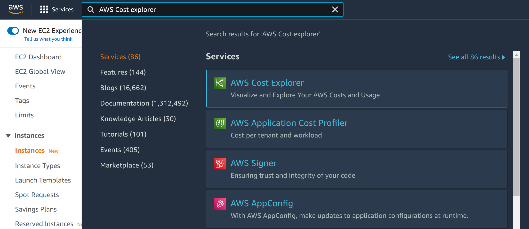 2. Search for AWS Cost Explorer in the search bar at the top left side of the screen and select it from the list of services.