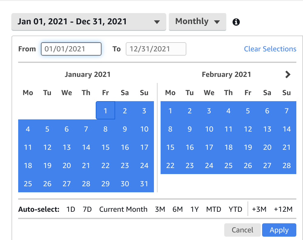 4. Select the time period for your report by either an option in the drop down menu or by selecting the start and end dates, then hit Apply (Figure 2).