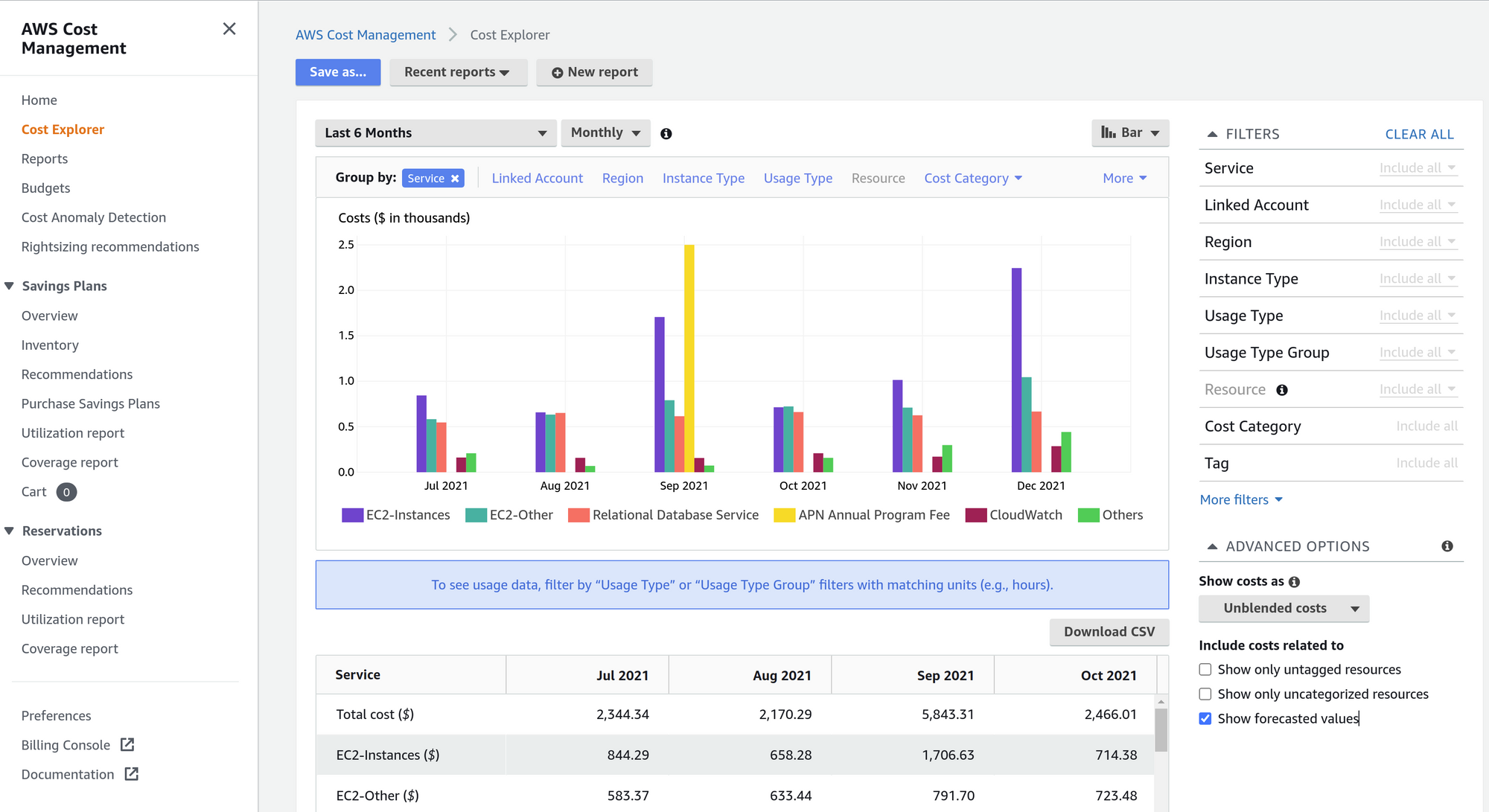 3. You will see a default report. To customize this report, navigate to Cost Explorer in the menu on the left hand side. Now you will see a monthly breakdown of services over the last 6 months (Figure 1).