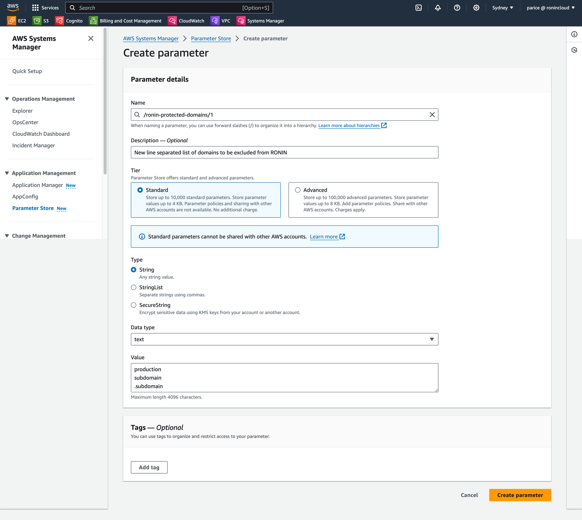 - If a "/ronin-protected-domains/1" parameter is not available, select "Create parameter", otherwise select this parameter and click edit to update your protected domains list.