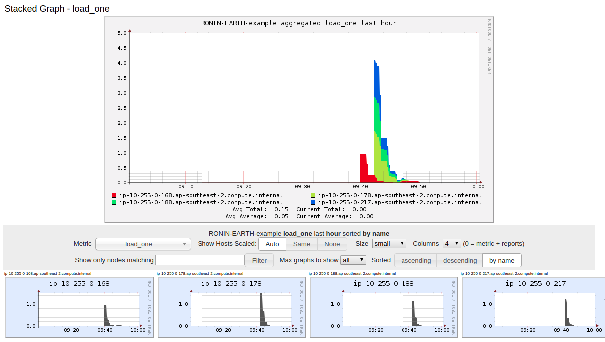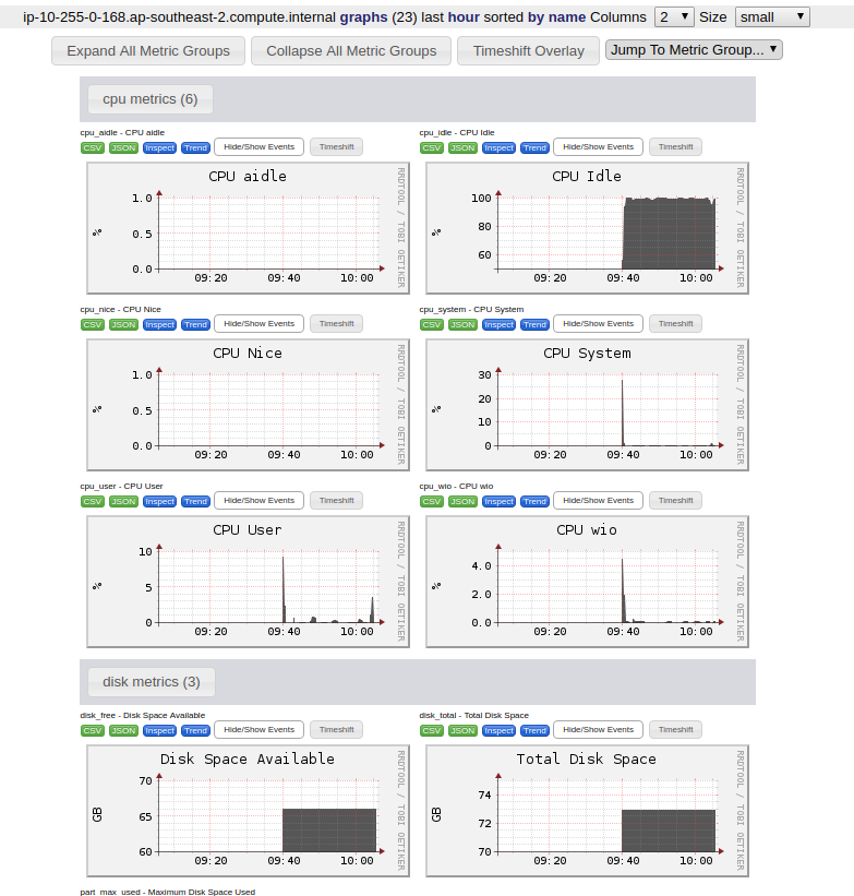 As your nodes grow and viewing them all on the main page becomes difficult, you can use the search tab to find particular hosts or metrics, using regular expressions. You can also compare hosts, create custom aggregate graphs, and more.