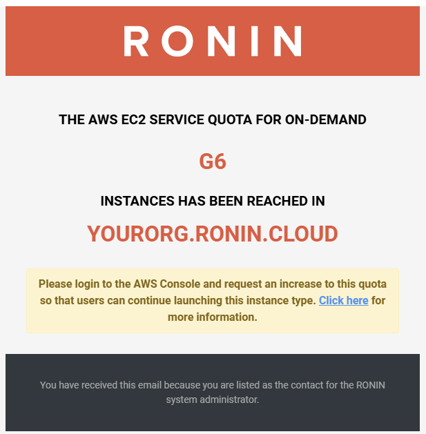 Have you received an email that looks a bit like this, after trying to launch a machine in RONIN? Read on to find out how to increase quotas for machines in RONIN so you can get moving quicker!