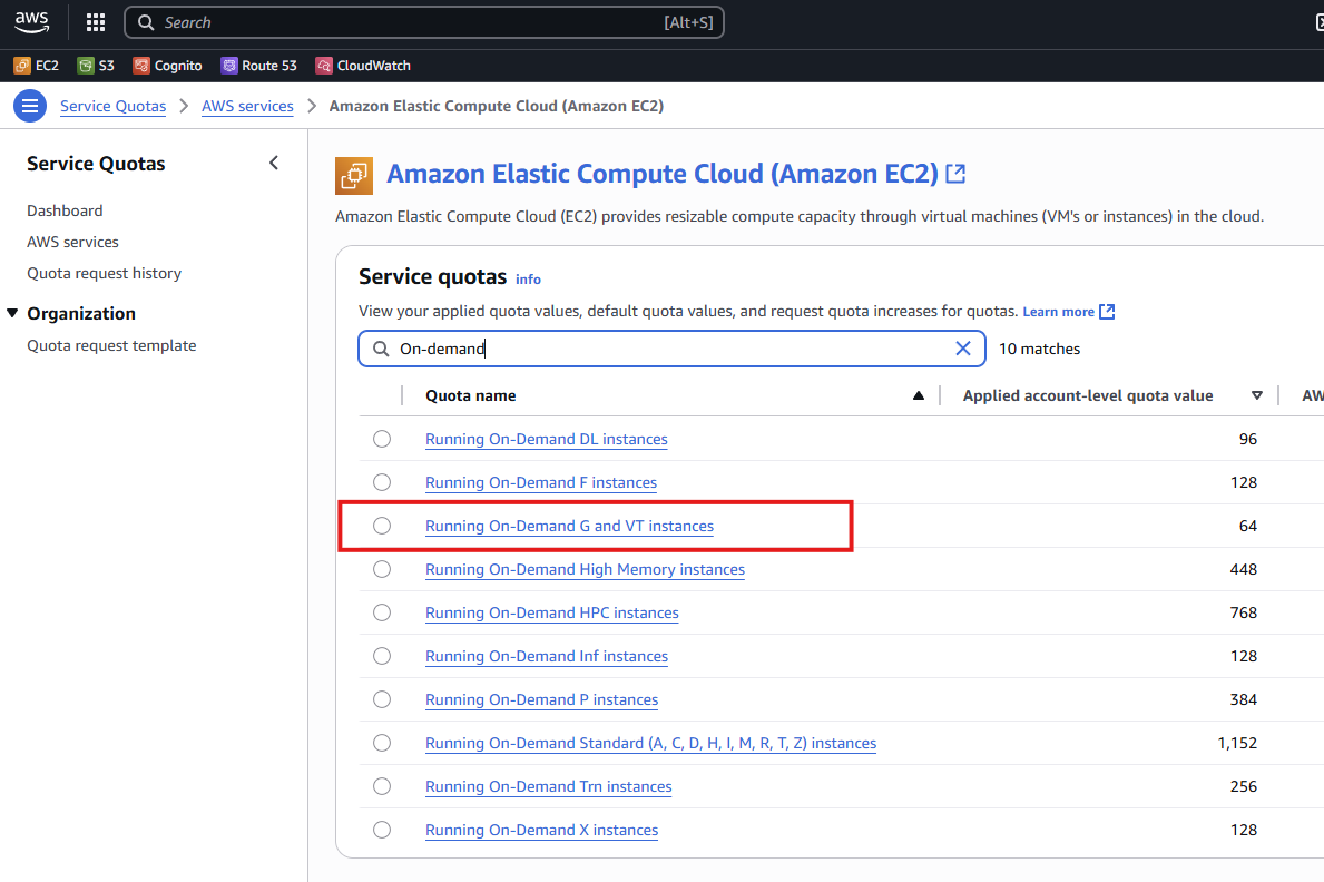 Search for "On-demand" and click on the quota you wish to increase. For this example we will increase the G Instance Type