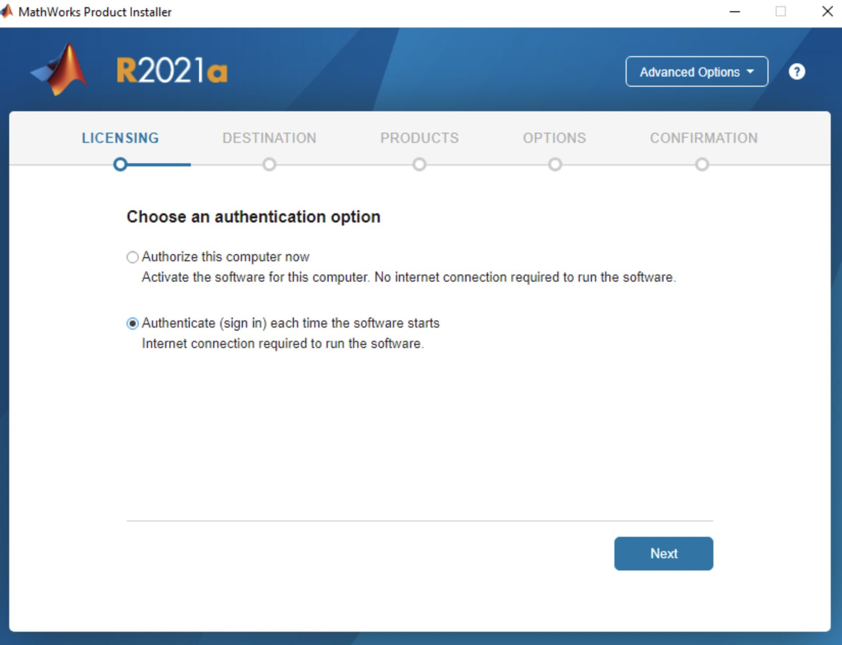 Next, select the "sign in" authentication option. This will let you be able to package this machine and launch MATLAB on another instance without having to go through the installation process again.