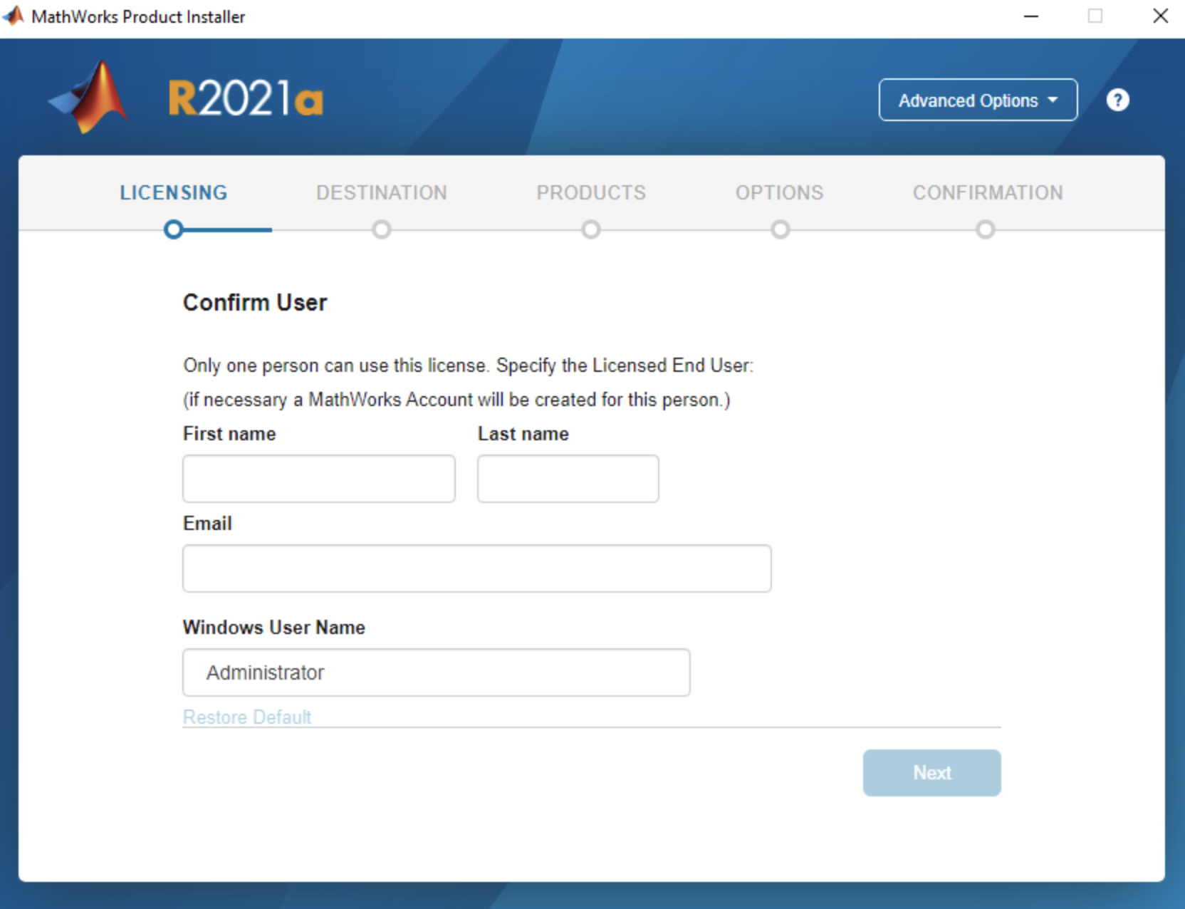 Enter your details and put "Administrator" as the Windows User Name.