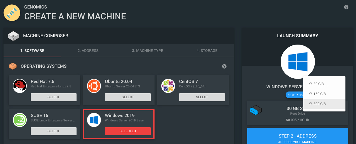 Create a windows machine with at least 8GiB RAM. You may need to add some extra space on your root drive depending on how many products you need to install. This can be achieved by clicking on the icon next to the root drive SSD and selecting a larger size as shown in the image below.