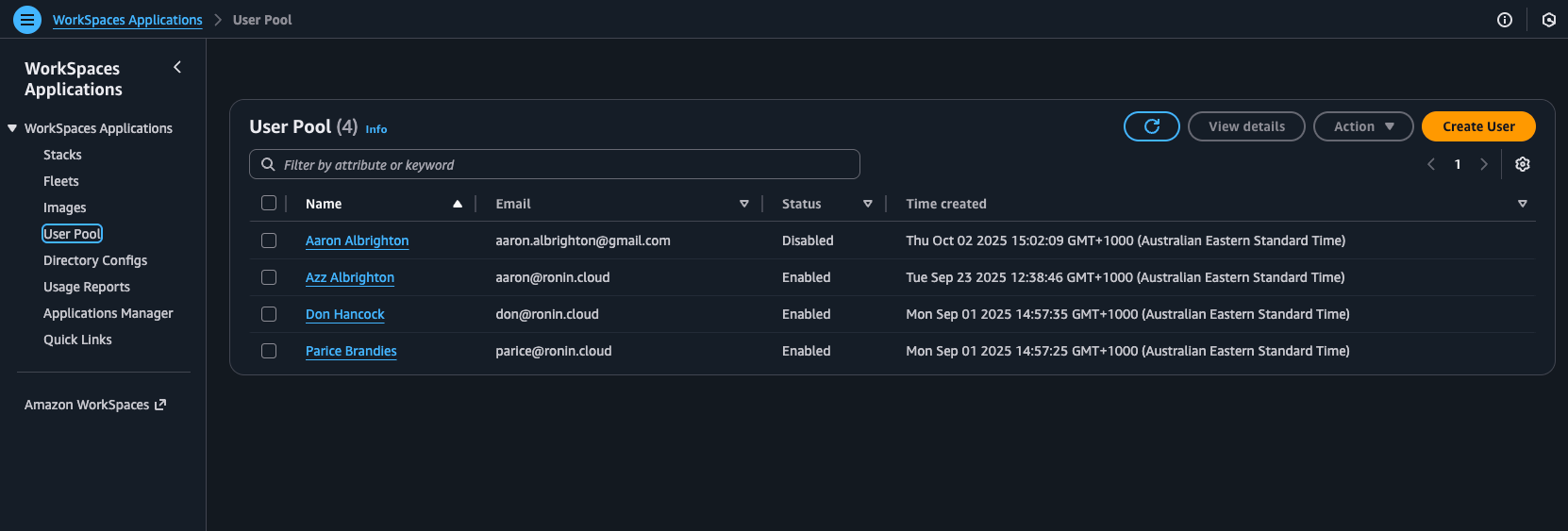 Once inside the WorkSpaces Applications console, look at the left-hand navigation sidebar. Under the WorkSpaces Applications section, click on User Pool.