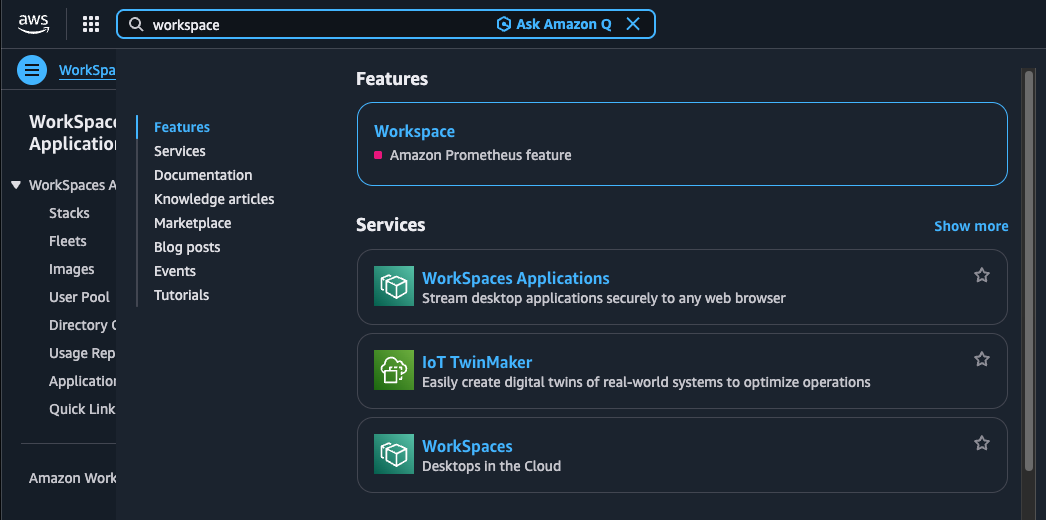 First, log into your AWS Console. In the search bar at the top, type "workspace". Look for and select WorkSpaces Applications from the results (you may see it described as "Stream desktop applications securely to any web browser").