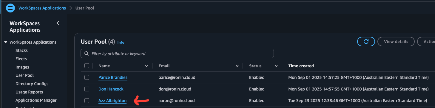 - Click on the specific user's email address in the User Pool list to open their details page.