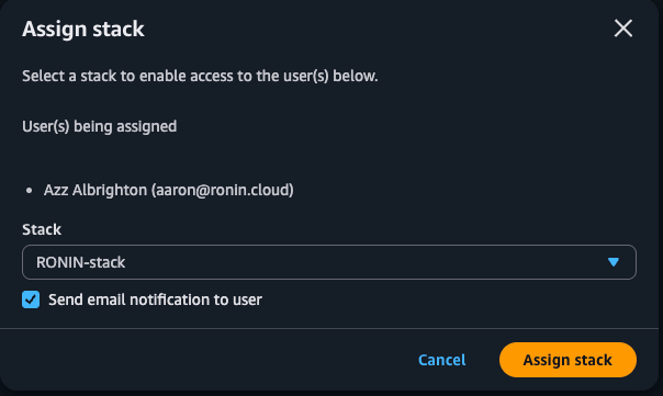 Ensure the send email notification to user is checked! And click Assign Stack