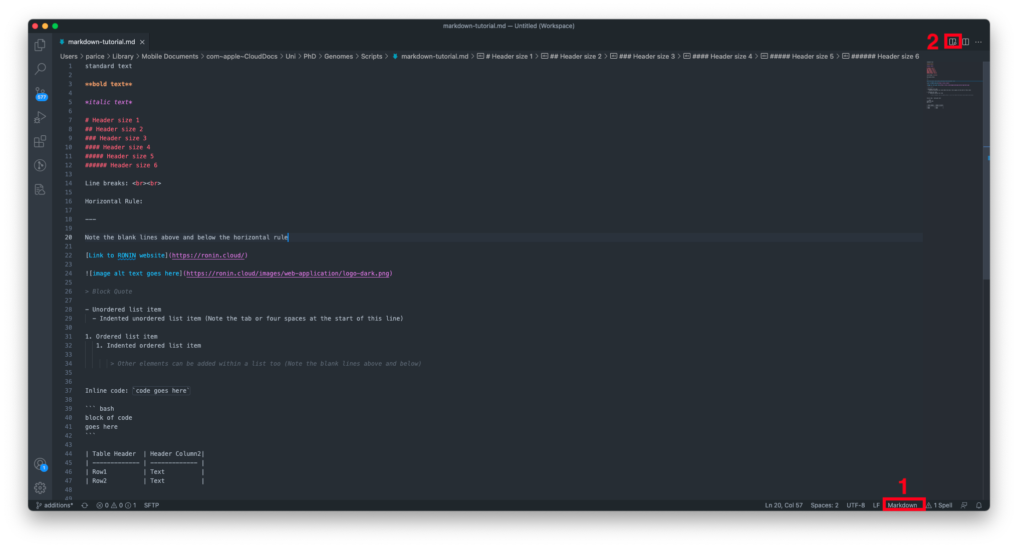 Alternatively, if you read our previous blog post and are already using Visual Studio Code to write and manage all of your code (we're so proud!), you will be happy to know that Visual Studio Code has built-in support for Markdown, including the ability to preview Markdown documents right within VS Code. To preview your Markdown documents, first, ensure that you have selected Markdown as the language for the document (see 1 in the screenshot below) and then select the preview button in the top right (see 2 in the screenshot below).