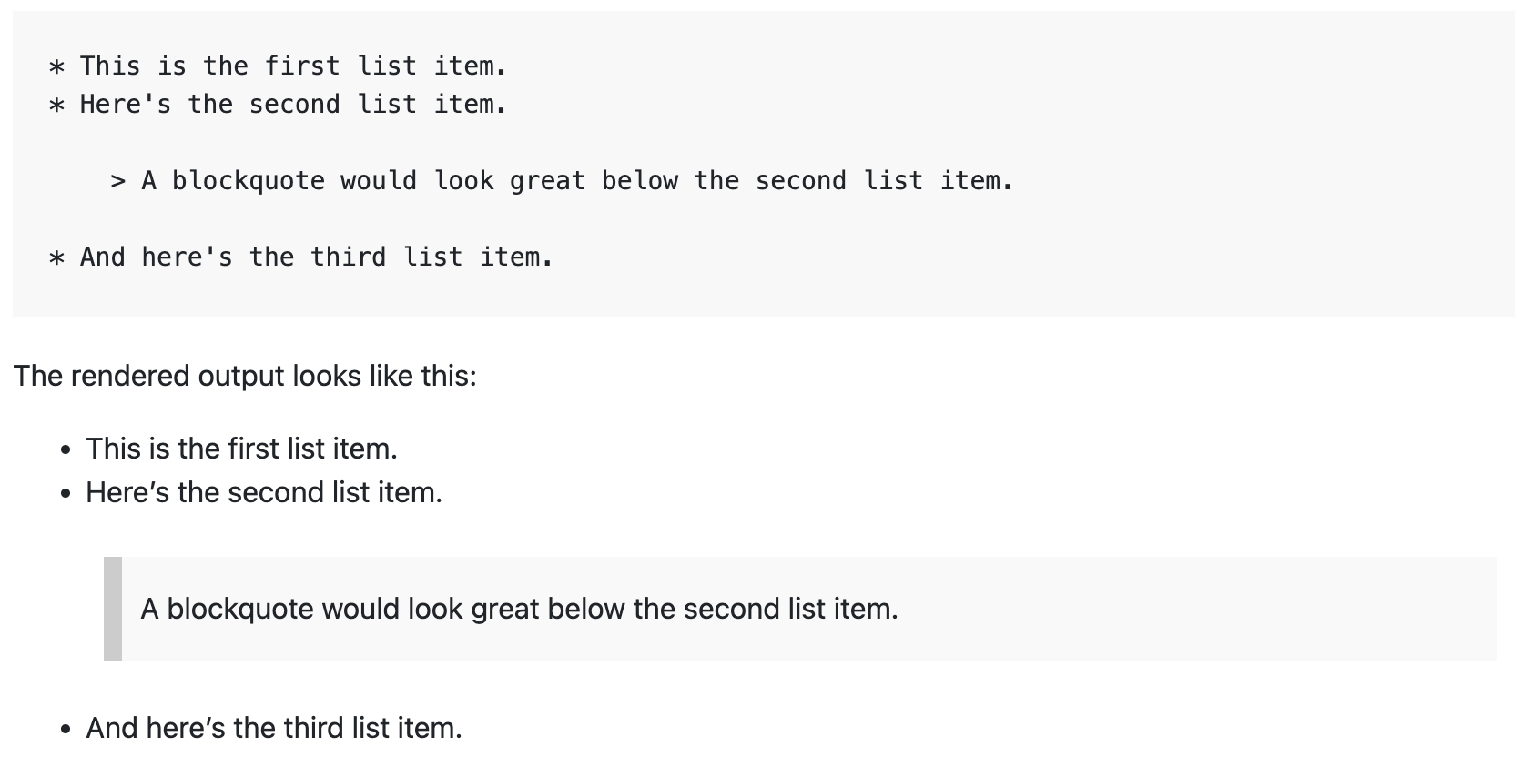 Other elements (e.g. a block of code, a quote, or an image) can also be added into a list but the element must start with an indent and have a blank line above and below it as follows: