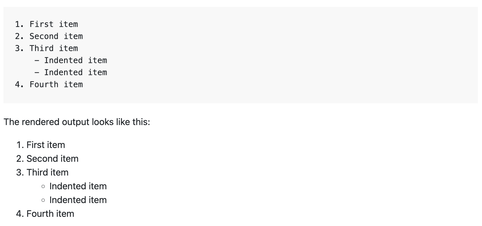 Nested lists can be created using indentation prior to the hyphen or number (one tab or 4 spaces is equivalent to one level of indentation). You can even nest an unordered list within an ordered list and vice versa: