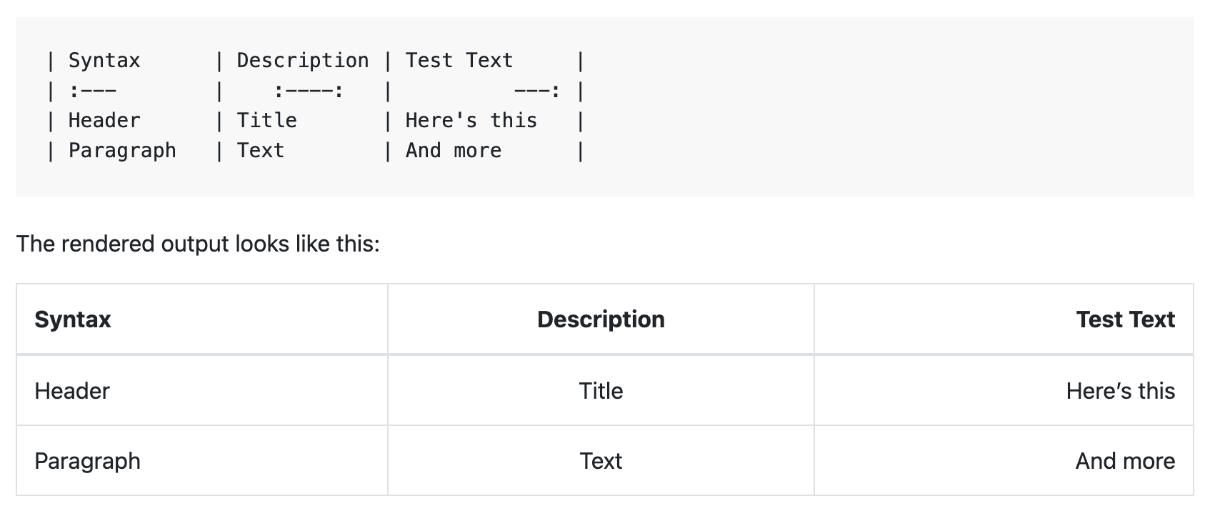 You can even create tables with Markdown! To add a table, use three or more hyphens --- to create each column’s header, and use pipes | to separate each column. You can align text in the columns to the left, right, or center by adding a colon : to the left, right, or on both side of the hyphens within the header row: