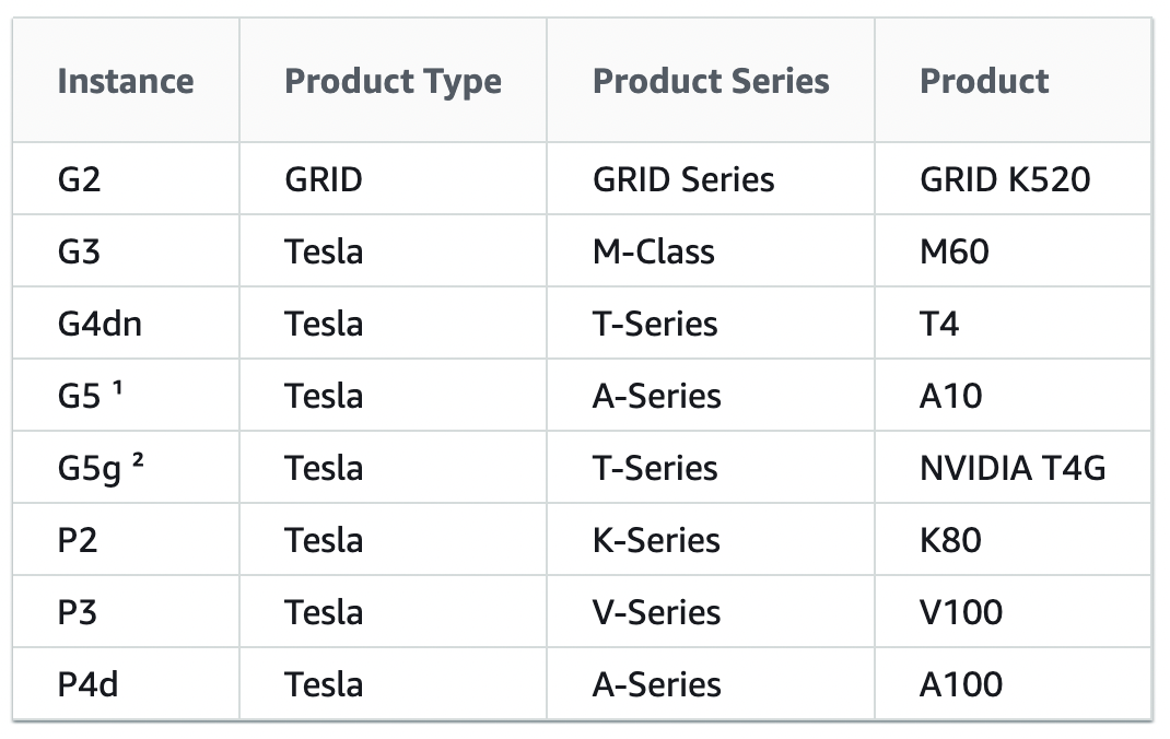 2. Search for the 64-bit NVIDIA driver appropriate for your instance type using this online tool: https://www.nvidia.com/Download/Find.aspx. For Product Type, Product Series, and Product, use the options in the following table, then select the Operating System you chose in Step 1 of your machine creation and we recommend selecting the Recommended/Certified drivers as the final option.