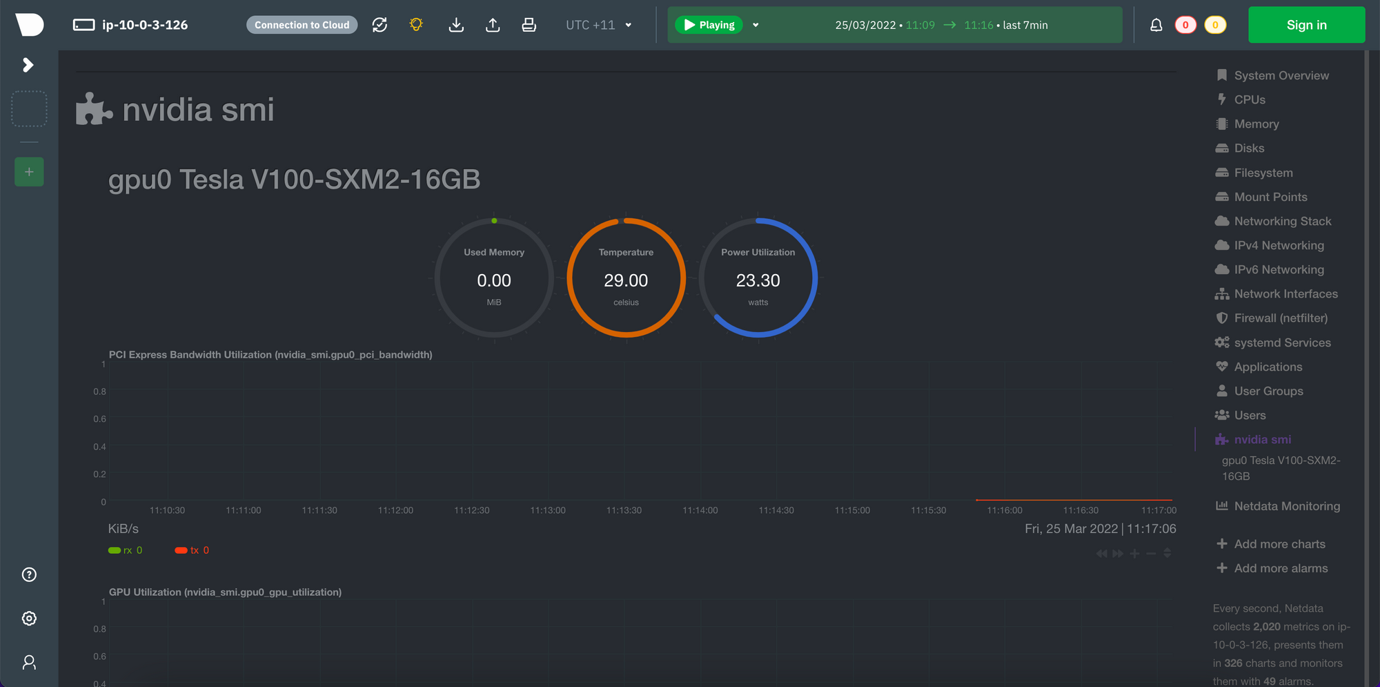 14. Connect to your Netdata dashboard again and you should now see a new menu item in the right menu called "nvidia smi". Click on this link and it will bring up a whole range of charts for monitoring your GPUs.
