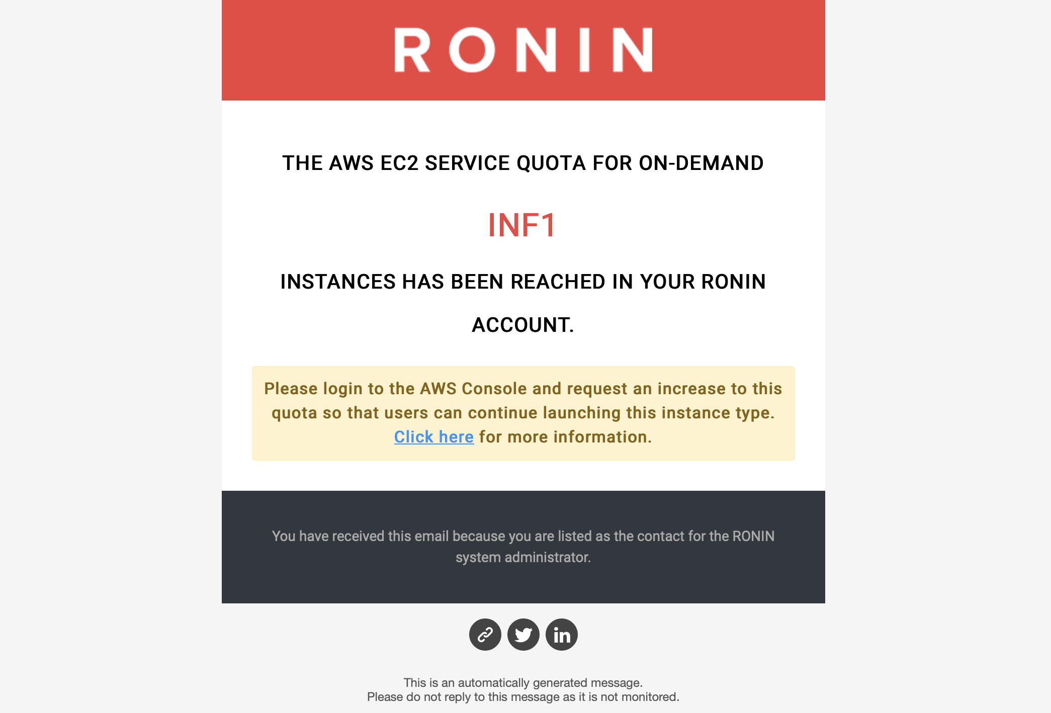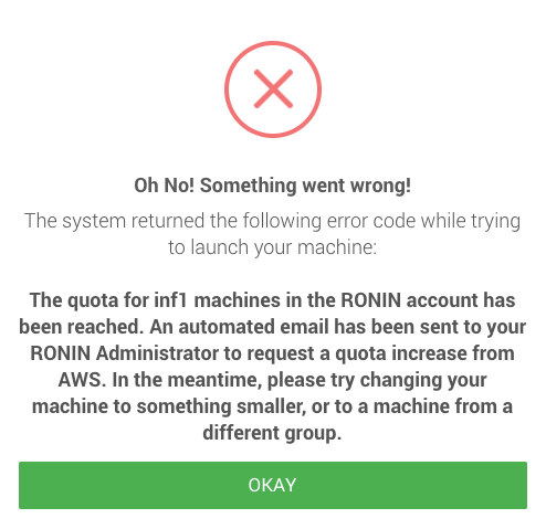 - If a user tries to start or launch a machine in RONIN that surpasses the currently set quota for that machine type in the RONIN AWS account, the user will now receive a more informative alert and the RONIN System Administrator for the account will receive an email alert advising them to request a quota increase from AWS for that machine group.