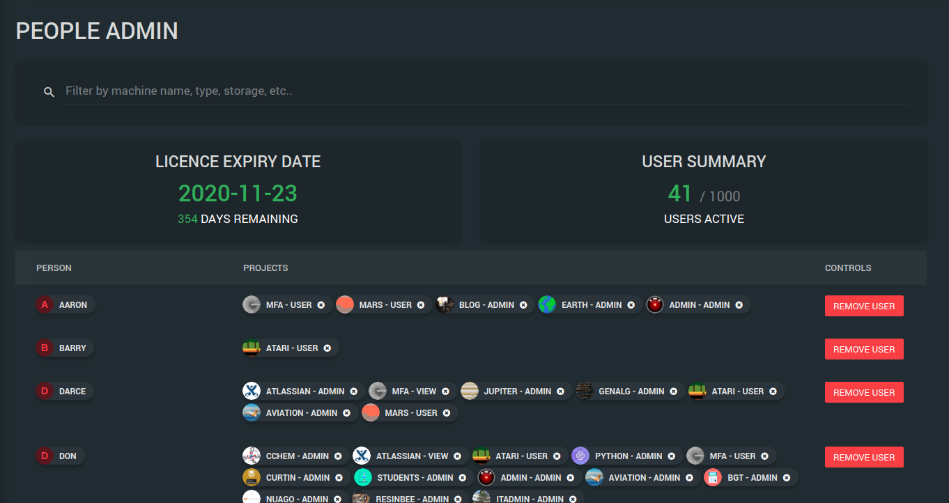 - Manage your active users, see licence details and remove user project access.