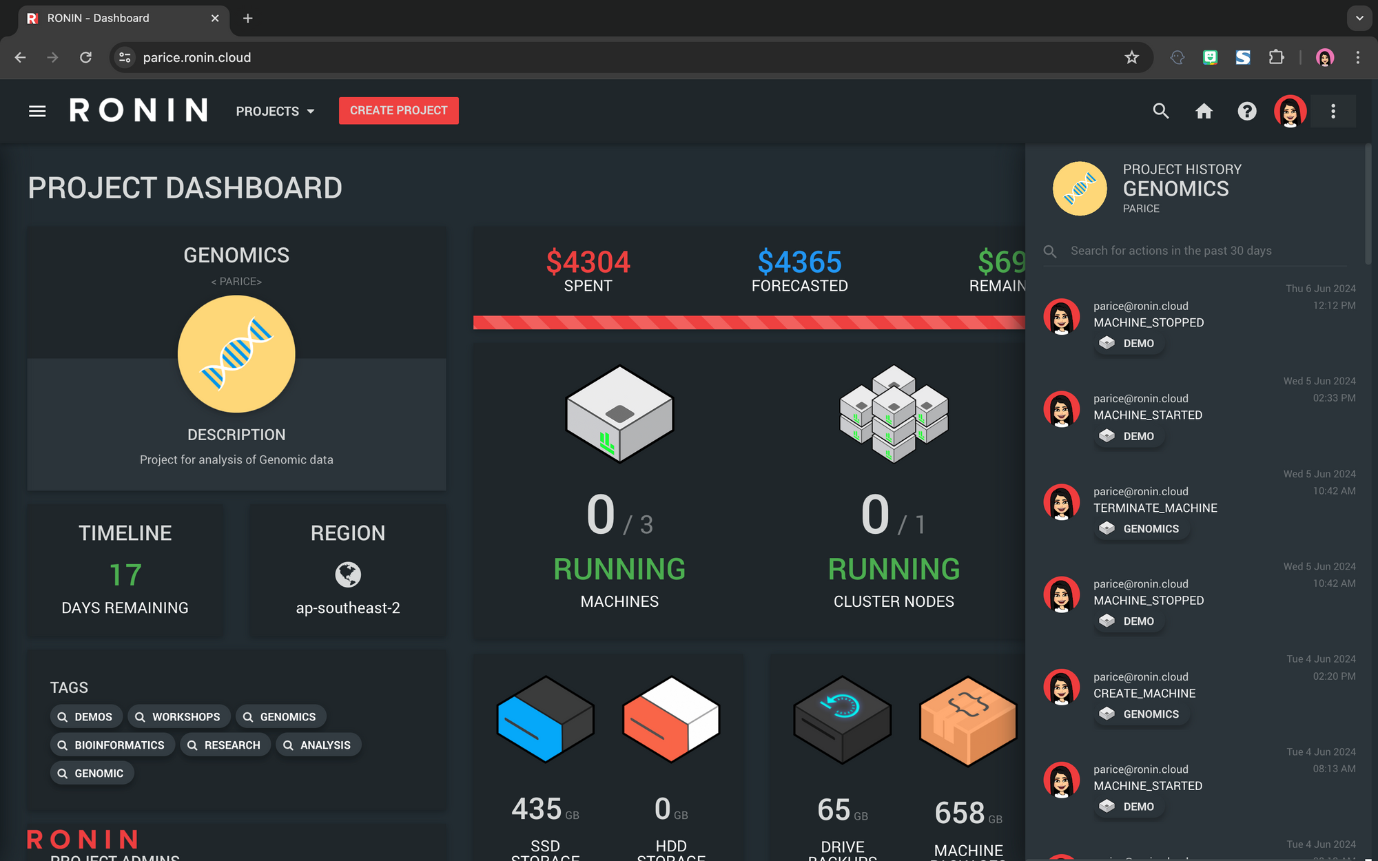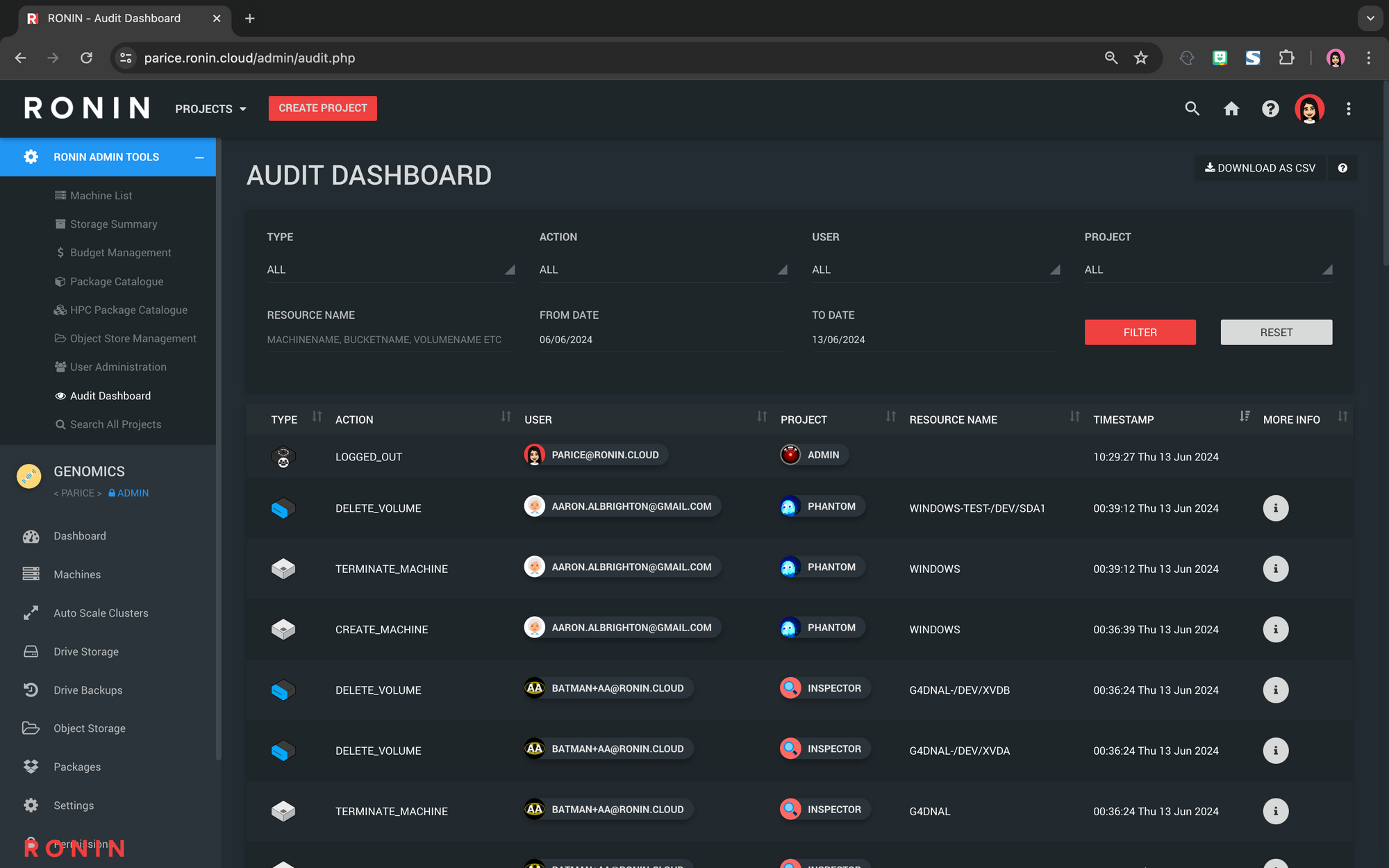- Dynamic table of all actions performed in RONIN across all users and projects