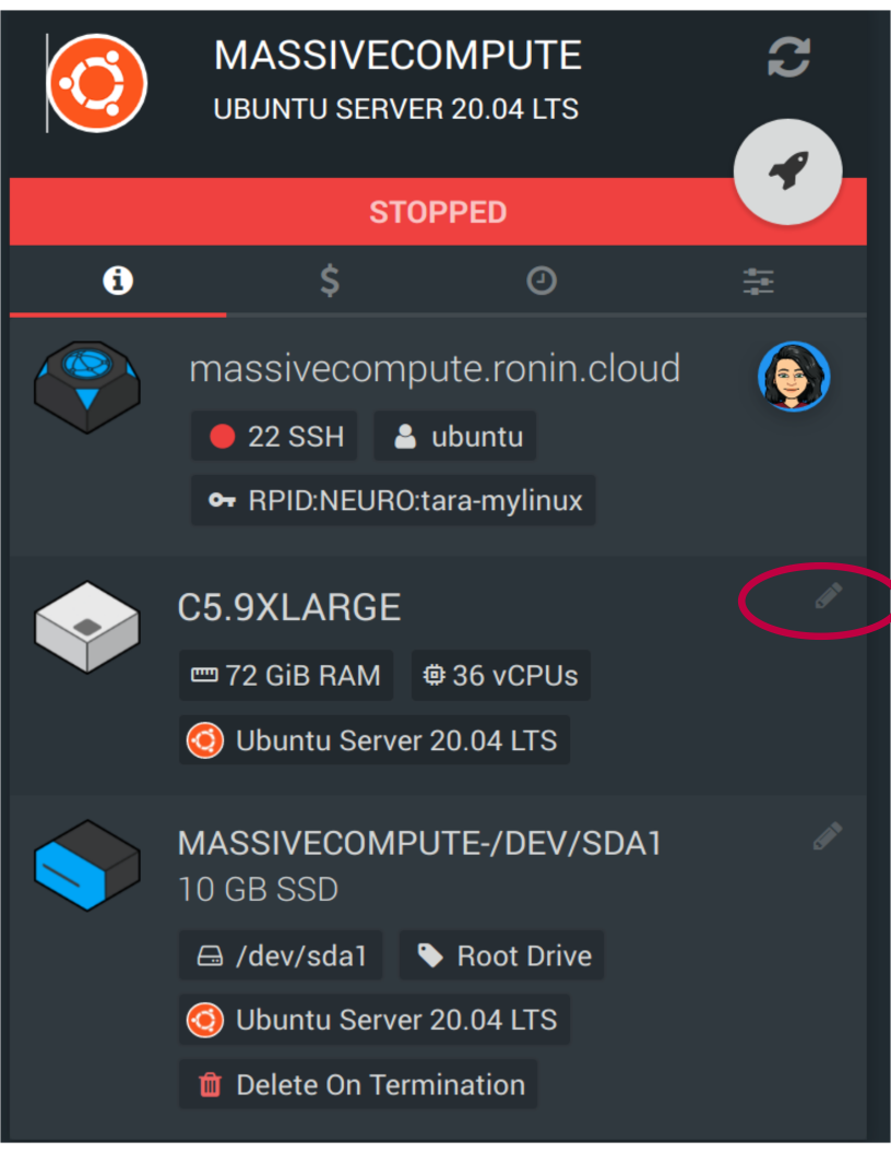 Once you have gotten your workflow running on the perfect instance, what happens when you are finished and want to write some code to analyze your results? No worries — you just need to stop your machine and click on the little pencil next to the instance type (see below), and switch from a massive compute optimized instance to, perhaps, a general purpose "t" instance.