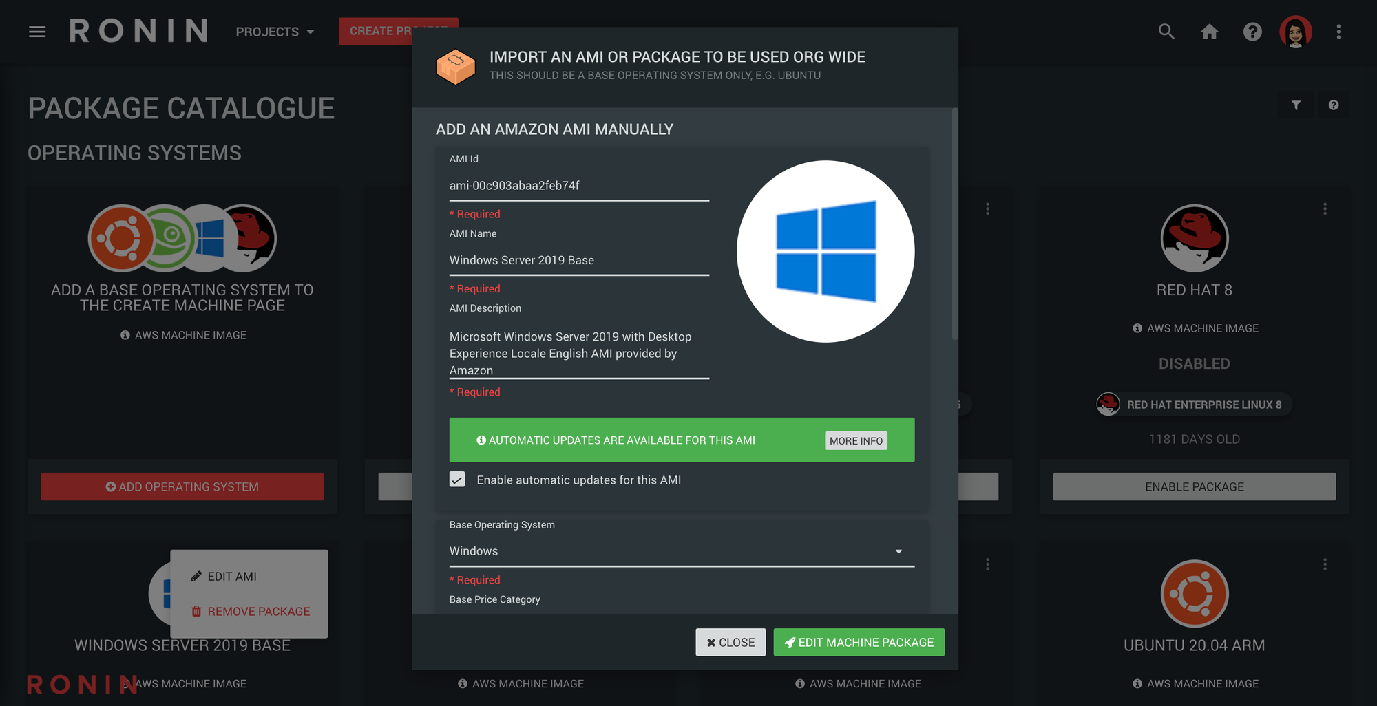 There are two different ways to add to a service catalogue. A RONIN Package, or an AWS AMI. Below we explore adding both types: