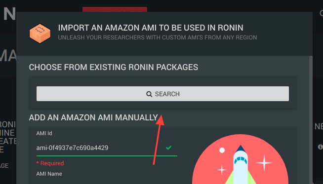 Find the ami id of the software you wish to include in RONIN. This can usually be found in the EC2 console create machine screen. Below is an example: