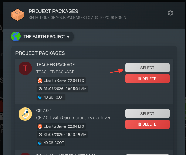 To fire up a package, navigate to the new machine page, click project packages and select your new package from the list!