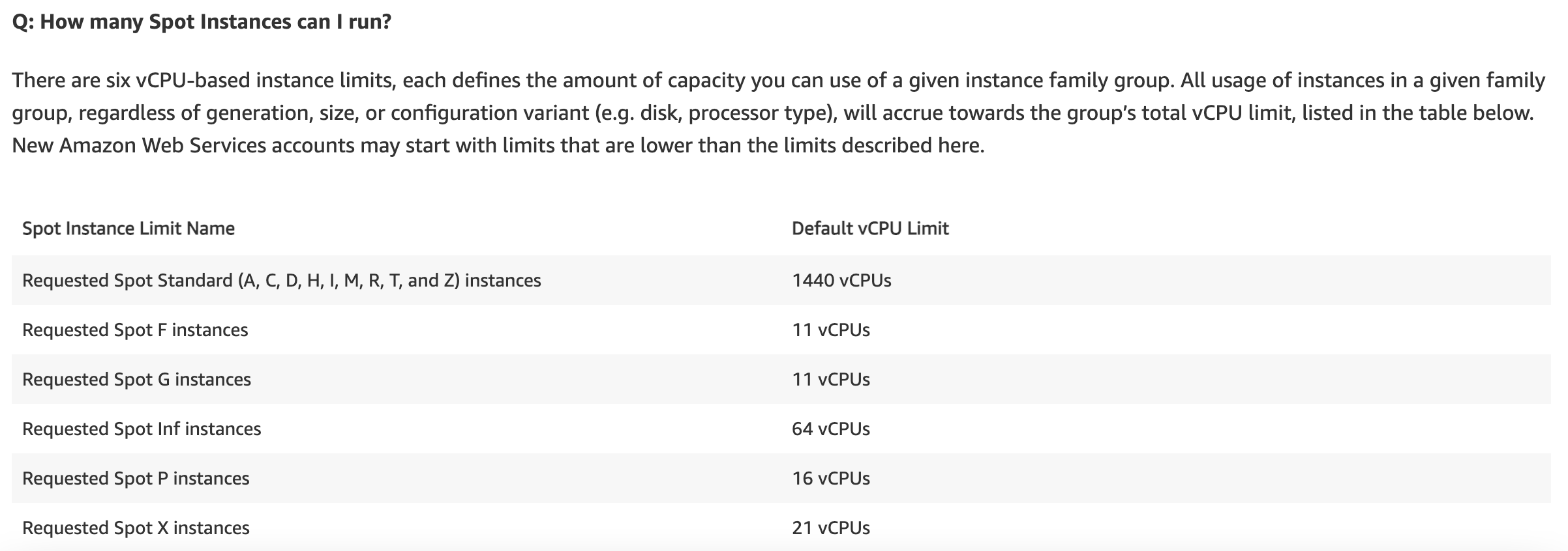 - Be aware of any vCPU-based instance limits (see below) and other EC2 instance quotas that may affect how many instances you can run. Remember that users in other RONIN projects may also be launching clusters and leveraging Spot instances. If you believe there should be capacity available for your chosen Spot instance type but your cluster continually fails to launch, you may need to speak with your RONIN administrators to request an increase to your account EC2 quotas.