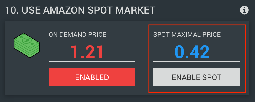 In RONIN, requesting Spot Instances for your auto scale cluster nodes is as simple as selecting the ENABLE SPOT button during step 10 of cluster creation and setting a maximal spot price: