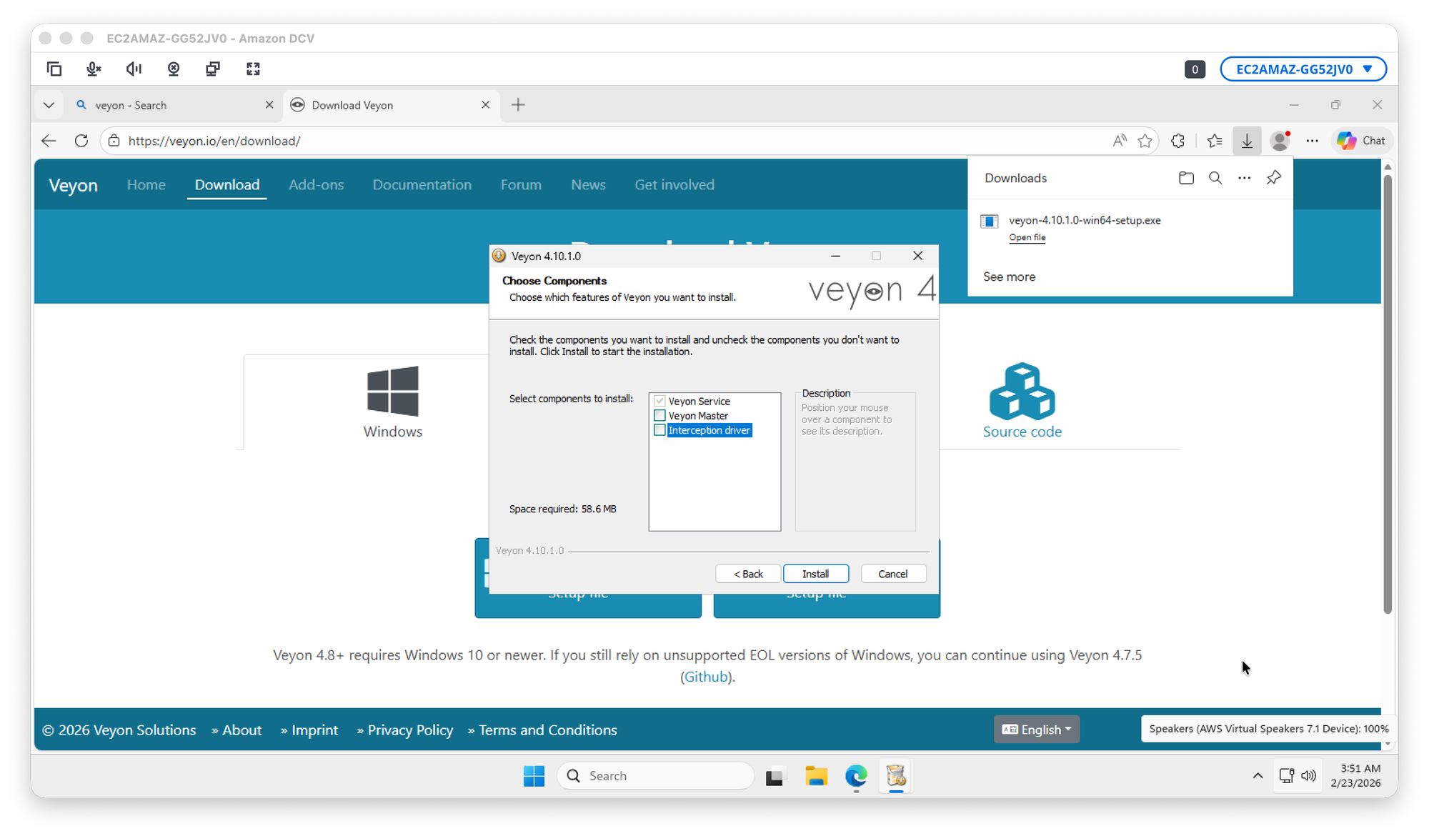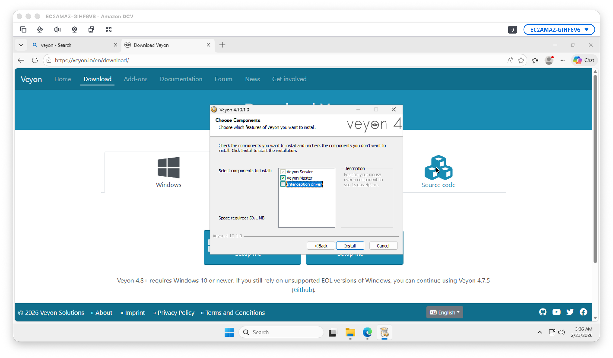 - Open the Veyon Installer and ensure the Veyon Master component is selected for install and deselect the Interception Driver (it is not recommended for remote desktop environments).