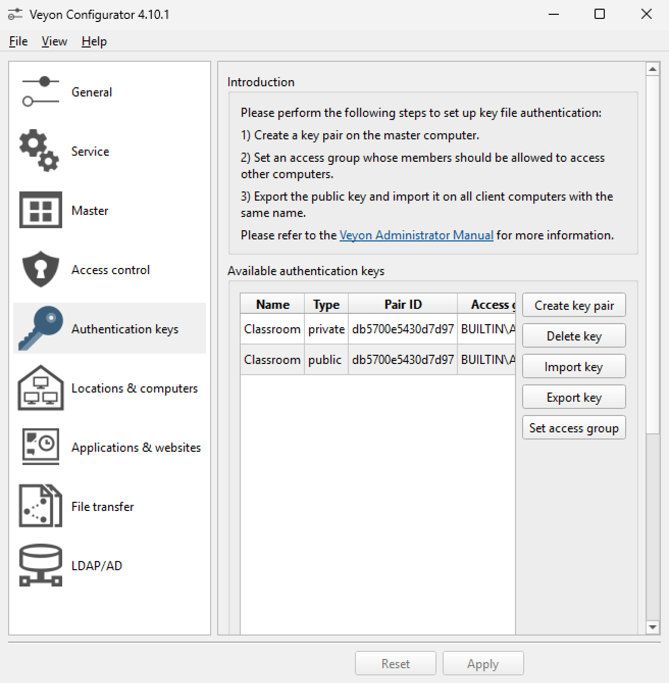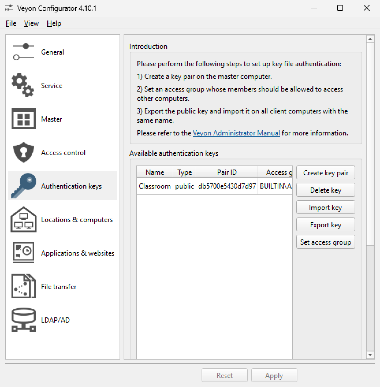 .pemfile e.g.Classroom_public_key.pem - In the Veyon Configurator go to Authentication keys and click Import Key. Select the