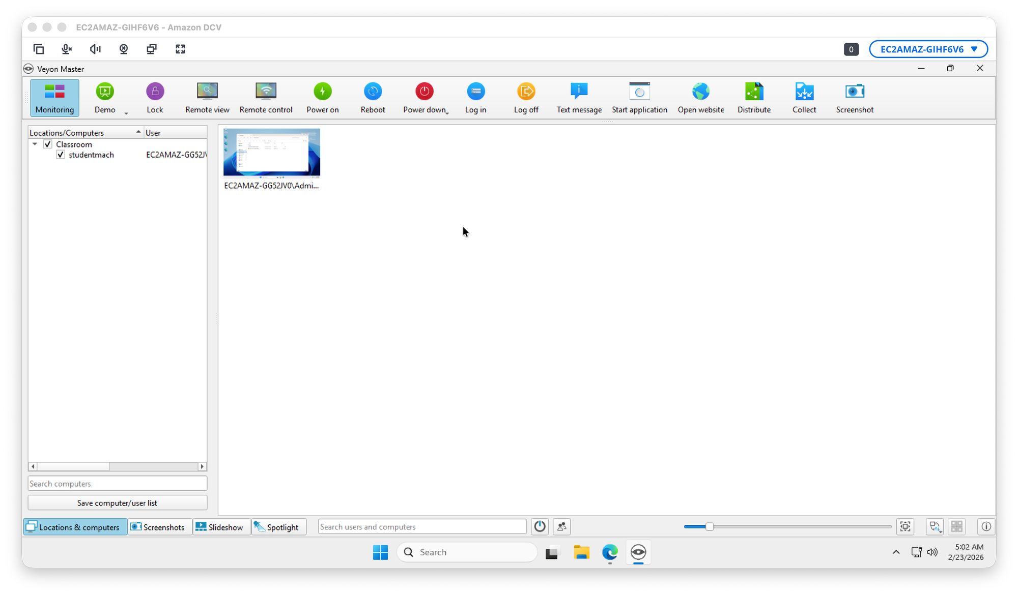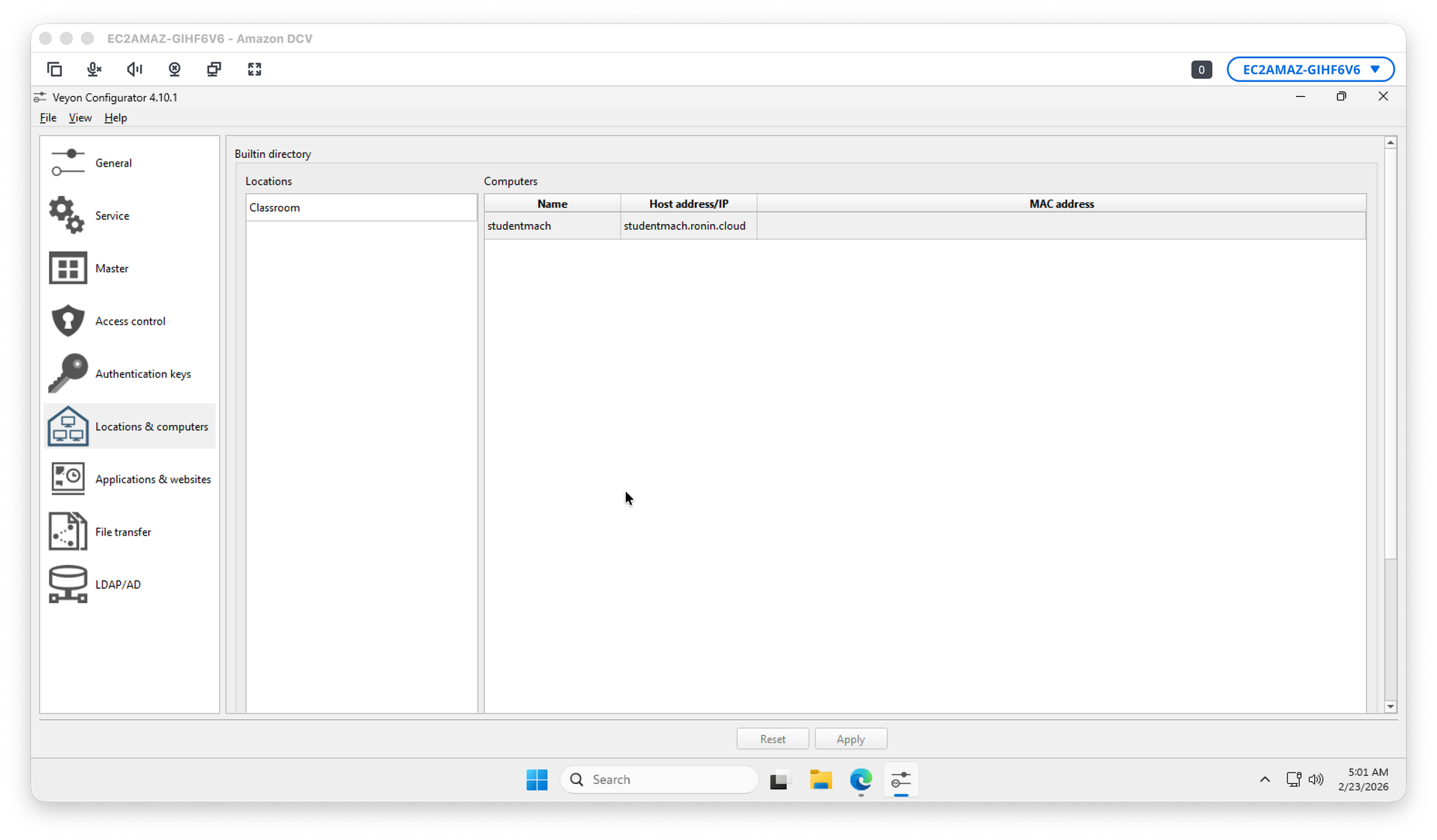 Your list of Locations/Classrooms and respective student machines should then appear in the Veyon Master tool under "Locations & Computers" in the bottom left: