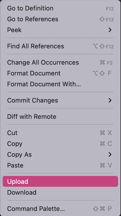Say you add a new file to your folder, or edit some code in a script and want these new changes to appear on your virtual machine. If you enabled uploadOnSave in your config file, all you have to do is save your file in Visual Studio Code and the latest changes will automatically be sent to your virtual machine. If you did not enable uploadOnSave, you can sync these files by right clicking anywhere in the script, or on the file name, and then selecting the "Upload" option.